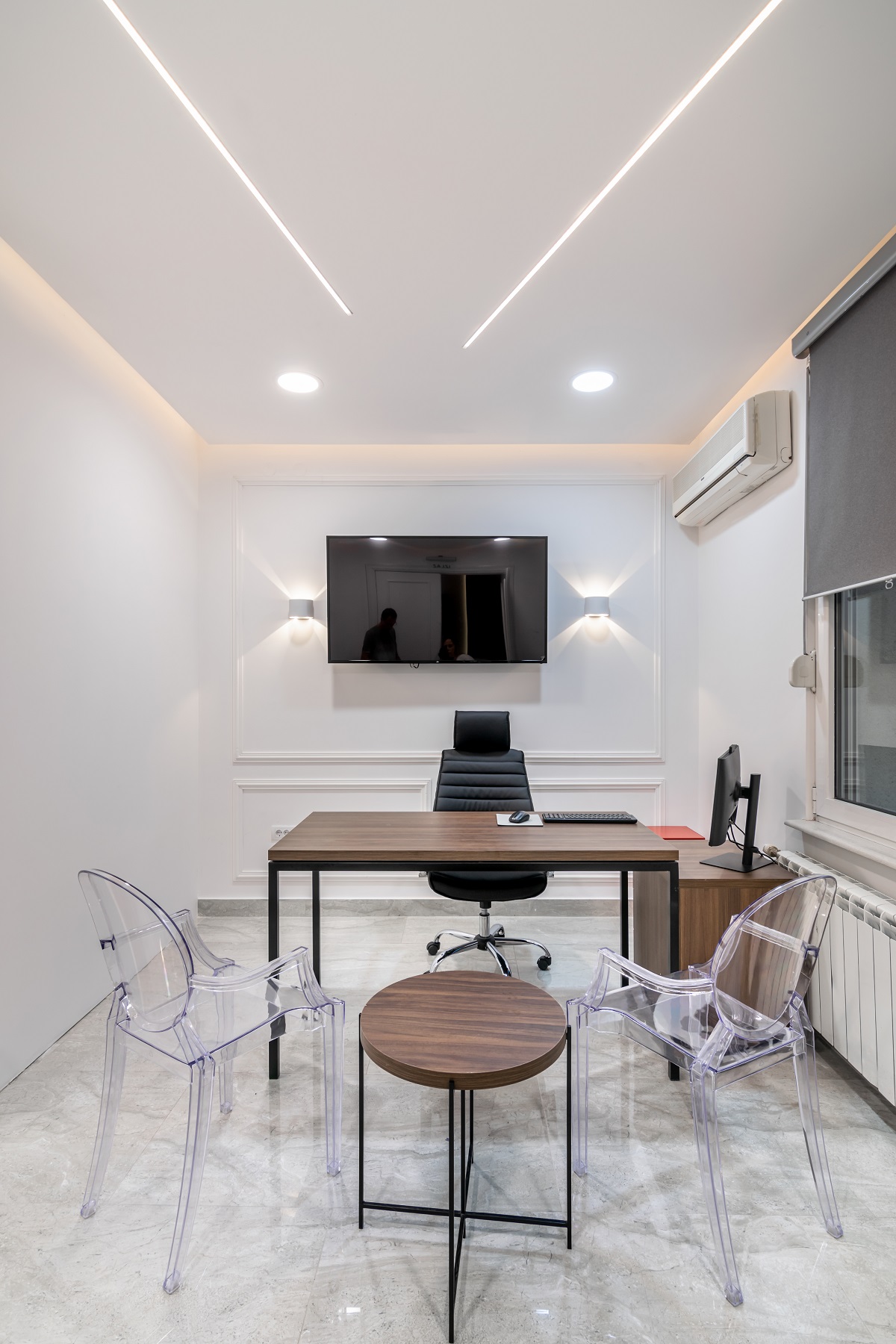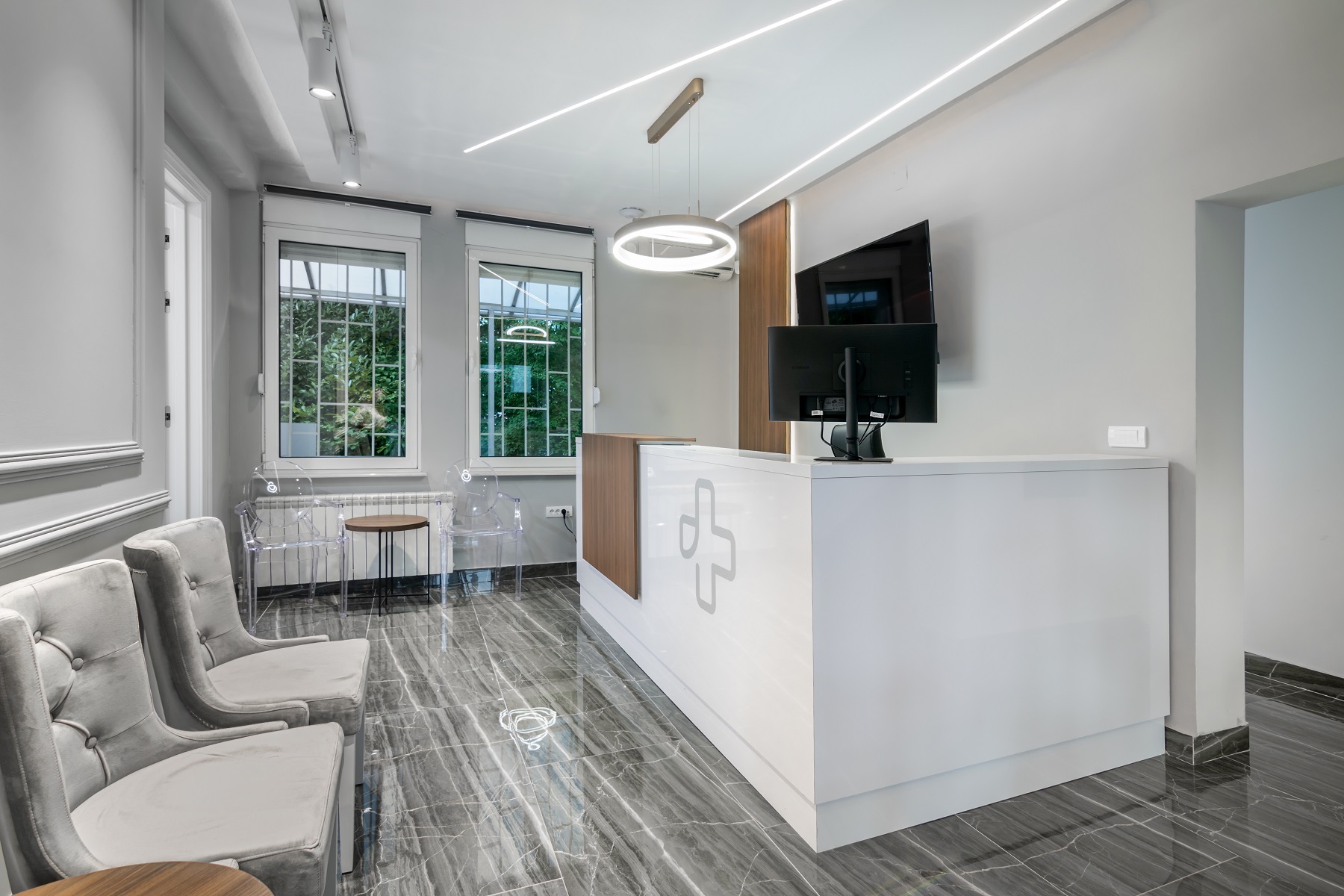 Dizajn enterijera klinike osmišljen je s ciljem da spoji funkcionalnost, estetiku i prijatno korisničko iskustvo. Prostor smešten u vili u Diplomatskoj koloniji karakterišu svetli tonovi i pročišćene forme, dok su detalji poput modernih rasvetnih tela i selektovanih komada nameštaja uneli dozu savremene elegancije. Prijemni prostor odiše toplinom i jasnoćom, dok su lekarske kancelarije i specijalističke sale organizovane tako da optimizuju tok rada i obezbede maksimalnu udobnost pacijentima. Suptilni kontrasti materijala i tekstura, kao i pažljivo postavljene vizuelne tačke, stvaraju harmonično okruženje koje podržava atmosferu poverenja i profesionalizma.