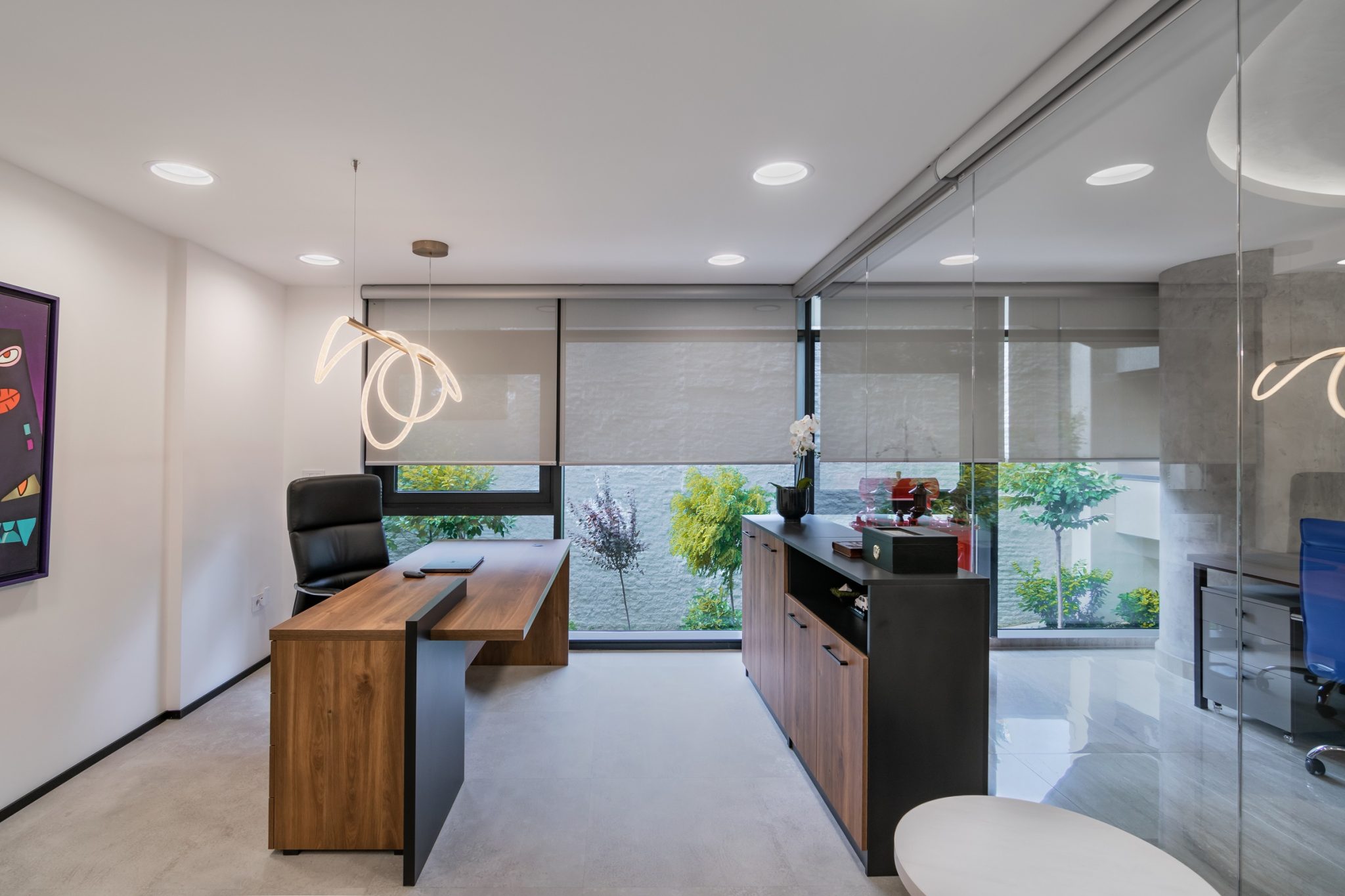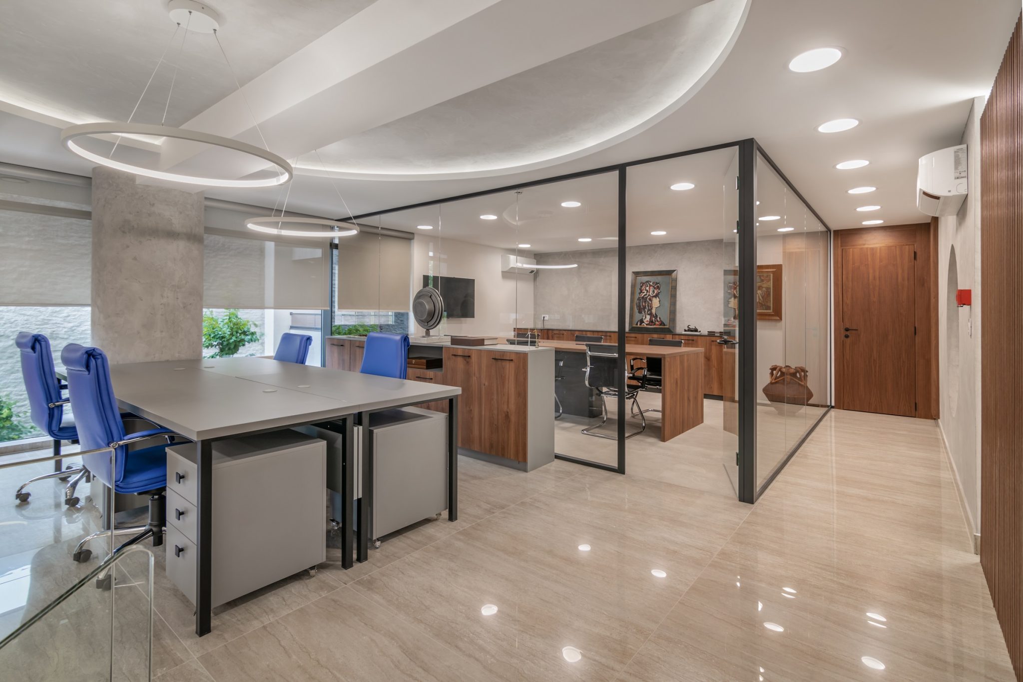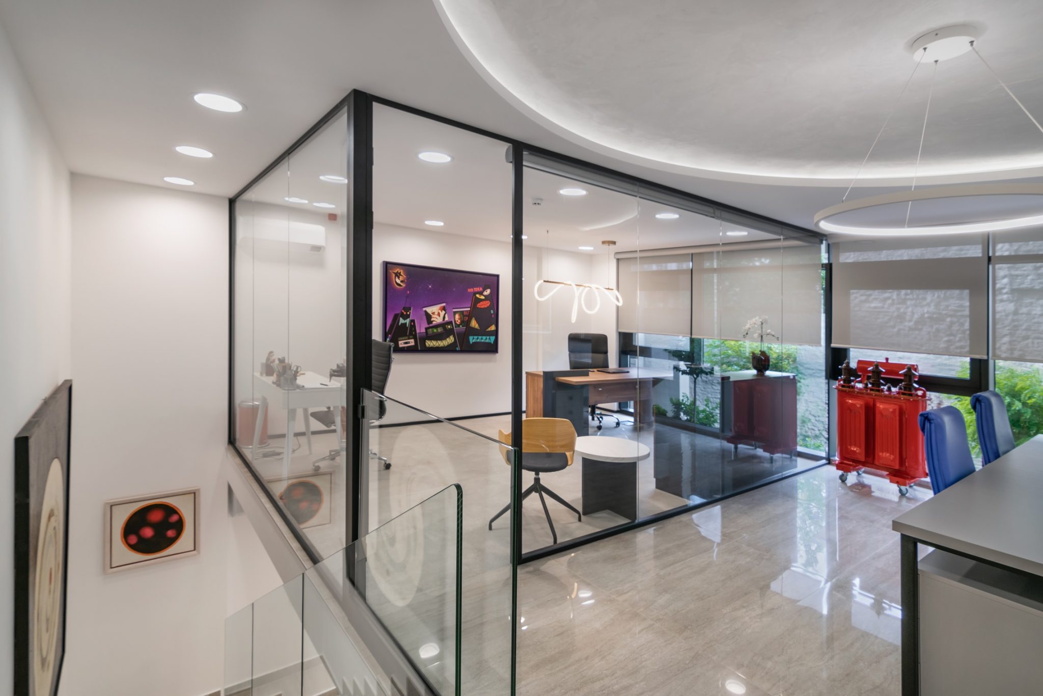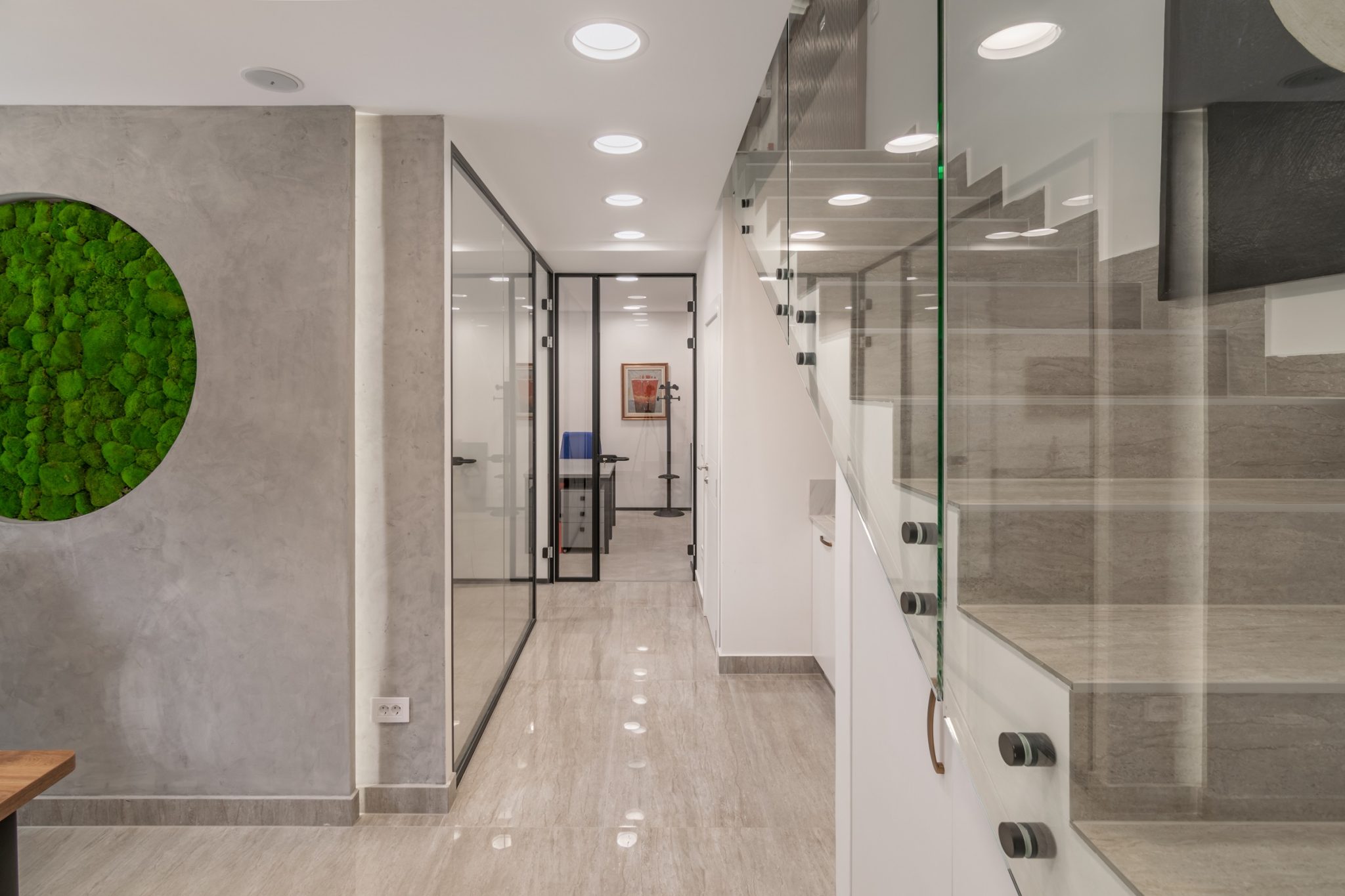 Ovaj poslovni enterijer odiše savremenom elegancijom i funkcionalnošću, kombinujući čiste linije, transparentne pregrade i materijale bogate teksture. Dominantna paleta neutralnih tonova oplemenjena je akcentima prirodnih elemenata poput detalja od mahovine, dok rasveta i nameštaj prate dinamiku prostora i naglašavaju njegovu reprezentativnu funkciju. Otvoreni koncept i staklene pregrade omogućavaju protok svetlosti i komunikaciju među timovima, čineći enterijer istovremeno otvorenim. Upečatljivi detalji i umetnička dela daju prostoru lični pečat.