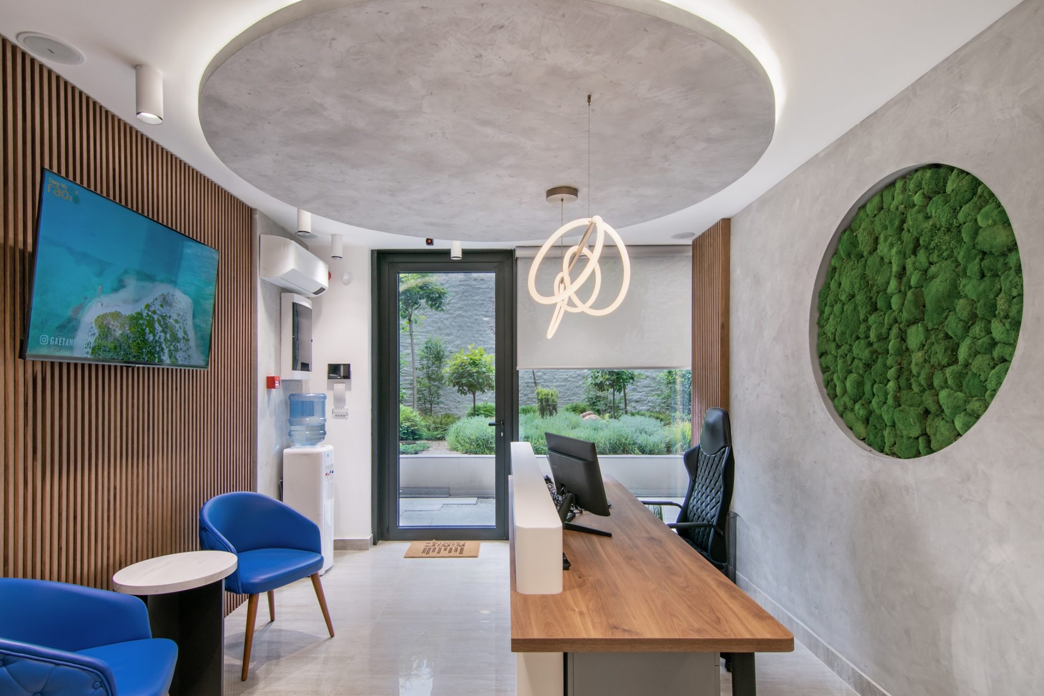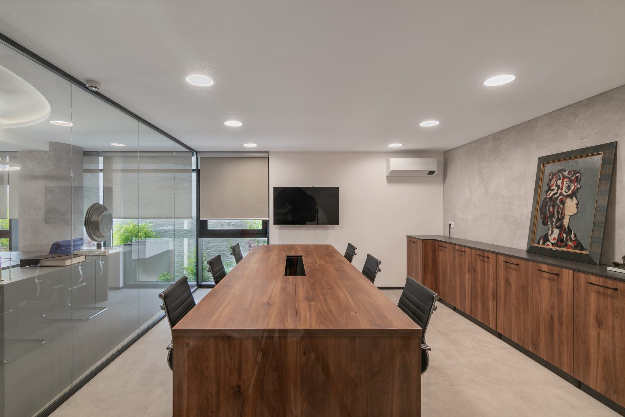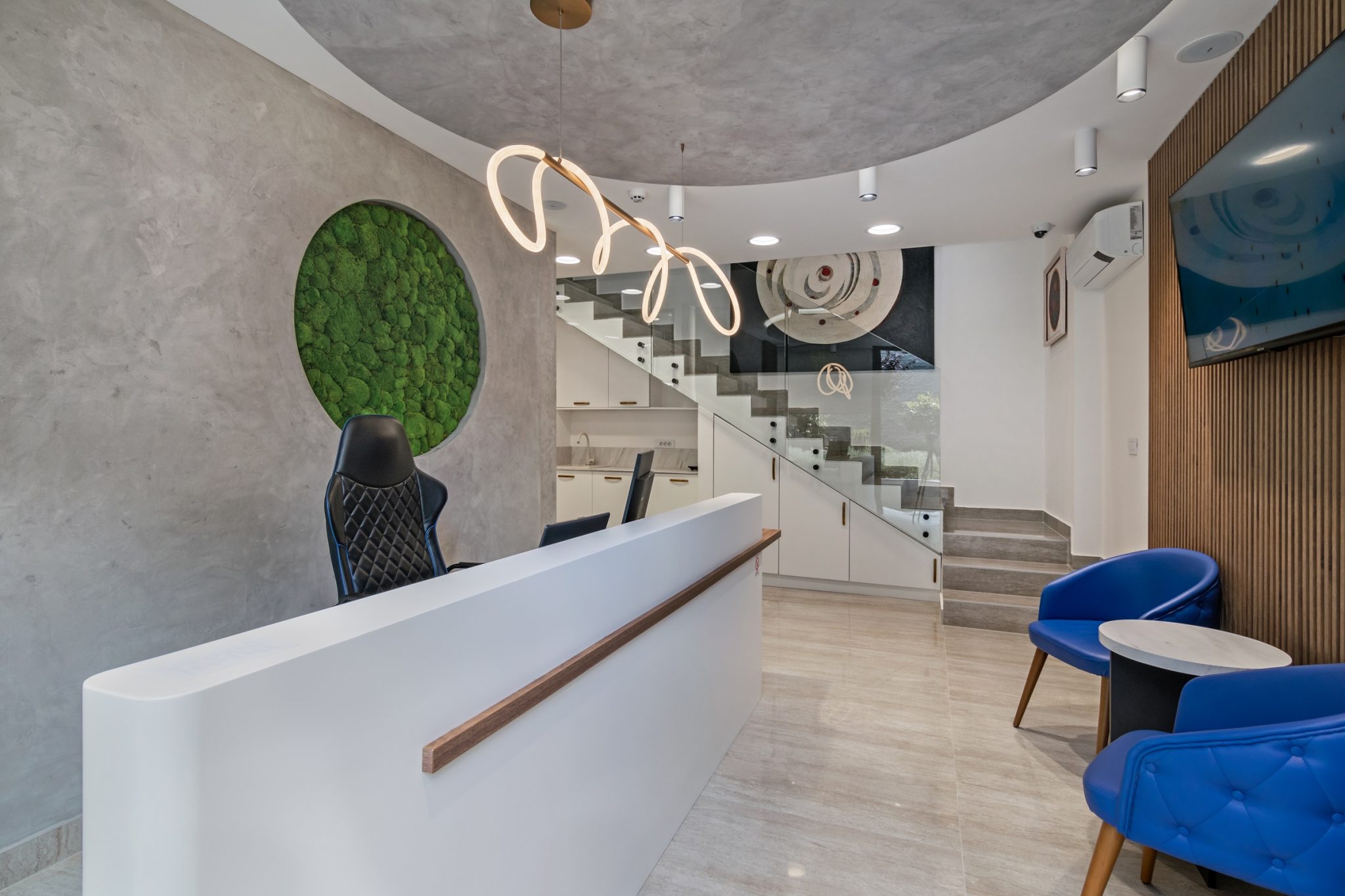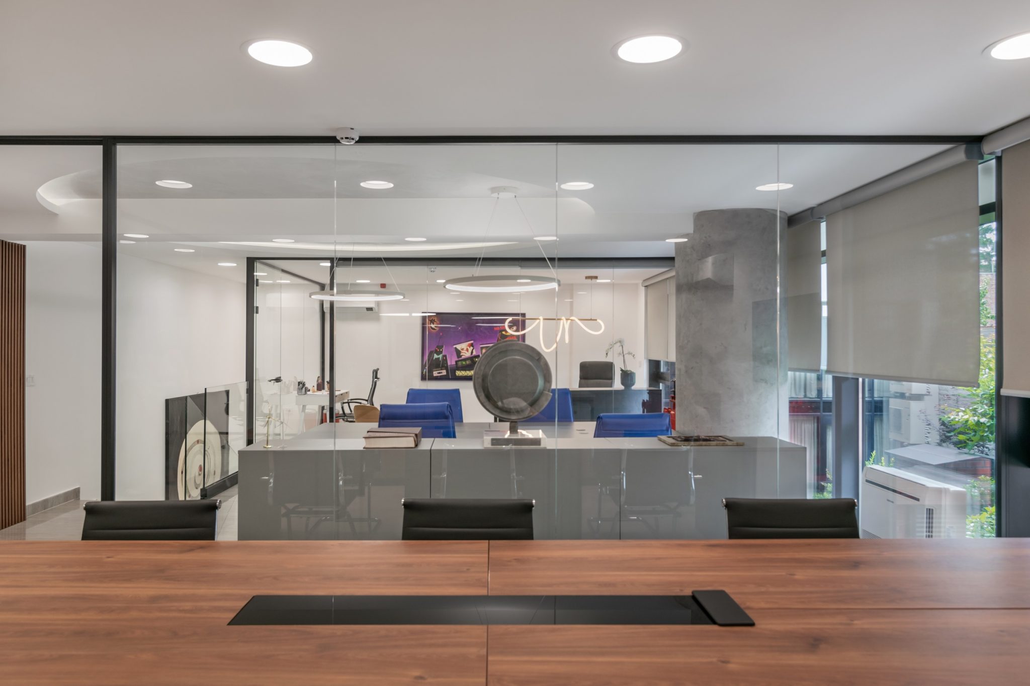 Ovaj poslovni enterijer odiše savremenom elegancijom i funkcionalnošću, kombinujući čiste linije, transparentne pregrade i materijale bogate teksture. Dominantna paleta neutralnih tonova oplemenjena je akcentima prirodnih elemenata poput detalja od mahovine, dok rasveta i nameštaj prate dinamiku prostora i naglašavaju njegovu reprezentativnu funkciju. Otvoreni koncept i staklene pregrade omogućavaju protok svetlosti i komunikaciju među timovima, čineći enterijer istovremeno otvorenim. Upečatljivi detalji i umetnička dela daju prostoru lični pečat.